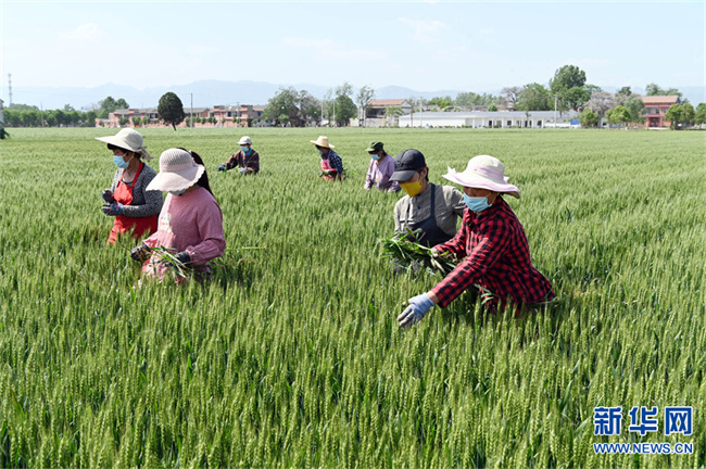 河南省沁陽市懷慶街道明王莊村,人們正在拔除混雜在