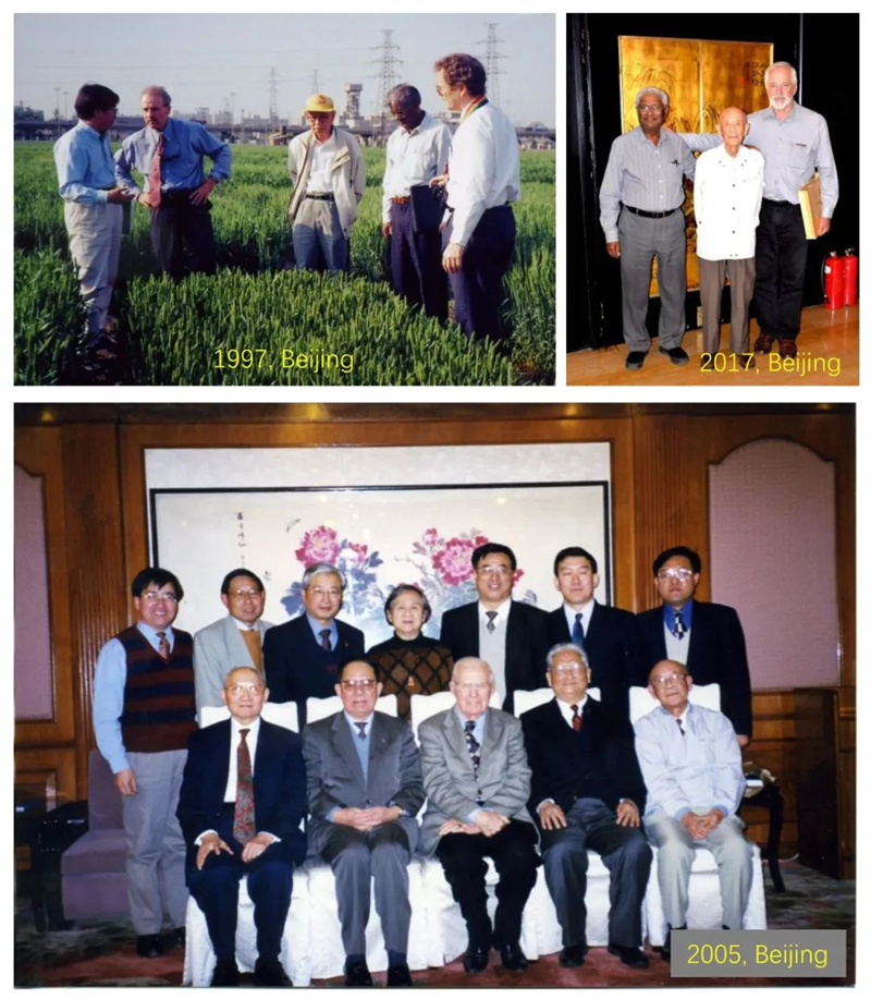 圖5 莊巧生先生主持和參與中國-CIMMYT的合作。上圖:莊先生接待來訪的CIMMYT主任和其他客人。下圖:莊先生(前排右一)與布勞格博士(前排中)等人在北京。照片由何中虎博士(現任CIMMYT-中國辦事處主任;后排左一)提供