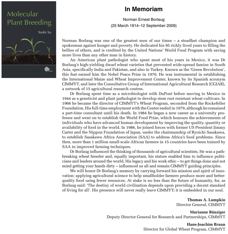 圖9 紀念諾曼·布勞格博士(Xu. 2010. Molecular Plant Breeding, CABI)
