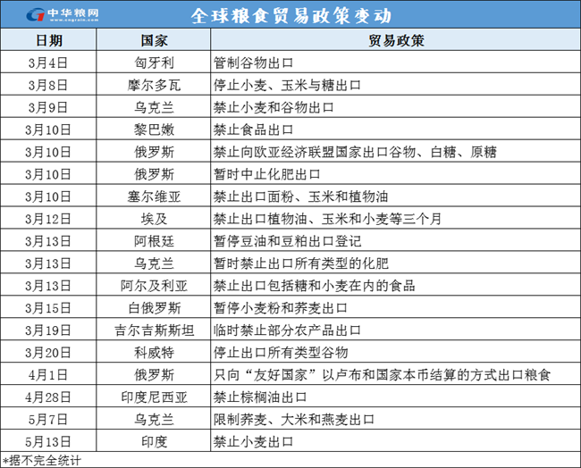 更為糟糕的是,除了兩大小麥出口國俄羅斯、烏克蘭,以及小麥生產大國印度外,哈薩克斯坦、塞爾維亞、摩爾多瓦等國家也紛紛開始禁止小麥出口。