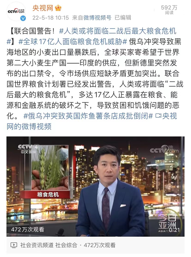 當前全球糧食市場供應短缺矛盾突出,聯合國世界糧食計劃署發出警告,人類或將面臨“二戰后最大的糧食危機”,多達17億人正暴露在糧食、能源和金融系統的破壞之下,導致貧困和饑餓問題的惡化。