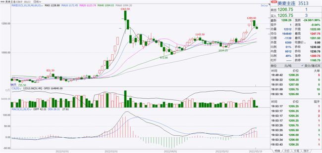 以小麥為例,2022年以來,CBOT小麥主力合約連翻上漲,尤其是俄烏沖突后,小麥年內漲幅一度超過70%,3月8日更是創下歷史新高,達到1363.5美分/蒲式爾。目前仍維持上漲趨勢,5月17日達到階段性高點1284美分/蒲式爾。