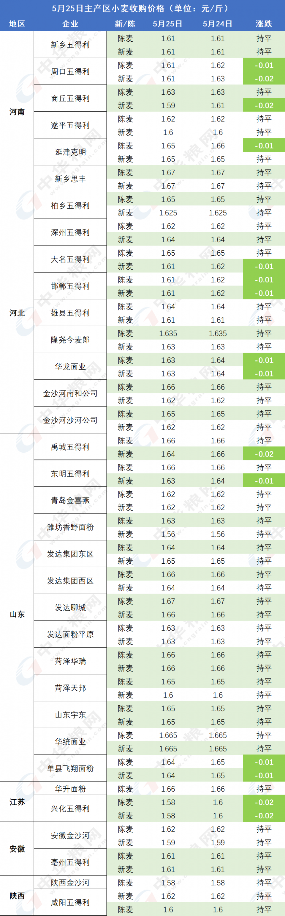 5月25日,隨著豫(yu)南、江蘇、安徽、湖北等地新麥上量增加,面(mian)(mian)(mian)粉加工企業繼續下(xia)調收(shou)購(gou)價(jia)格,部(bu)分面(mian)(mian)(mian)粉廠收(shou)購(gou)價(jia)格跌(die)破1.6。河(he)北、山東面(mian)(mian)(mian)粉廠收(shou)購(gou)價(jia)格基本在1.6以上。