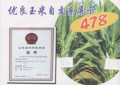 478玉米自交系是山東登海種業股份有限公司(原萊州市農業科學院)育成的優良自交系。478自交系綜合性狀好,配合力高,是我國超高產玉米的骨干自交系,豐富了我國的玉米種質資源。榮獲2005年度山東省科學技術獎一等獎。