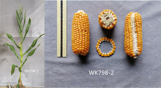 WK798-2(植物新品種保護名稱為金系865)是以昌7-2、K12、陜314、黃野四、吉853、9801等自交系組配成育種小群體,通過二次混合授粉后,從較大規模的后代分離群體中選擇優良基本株自交,通過南繁北育,連續六代自交選純育成。