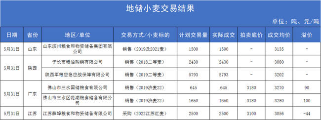 5月31日中儲糧山東分公司競價銷售2017-2020年小麥21121噸,成交9564噸,成交率45%,成交價3180-3320元/噸。