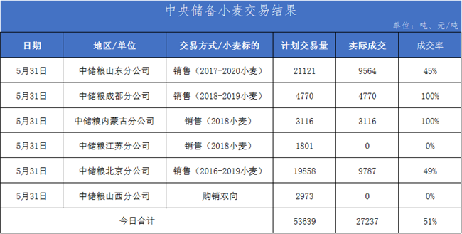 5月31日中儲糧北京分公司競價銷售2016-2019年小麥19858噸,成交9787噸,成交率49%,成交價3205-3270元/噸。