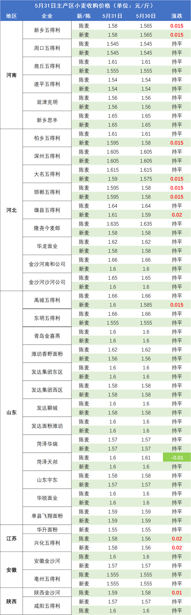 河南南陽牧原集團漲2分,自2022年5月31日10:00起,南陽區域牧原公司鄧州陶營、九龍飼料廠掛牌小麥調整為2960元/噸,其他價格及質量標準不變
