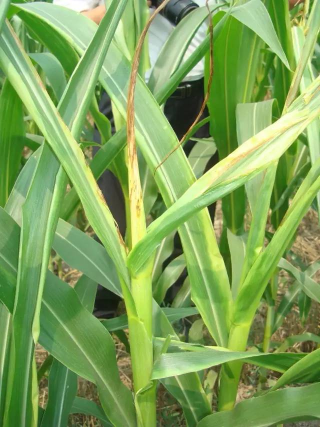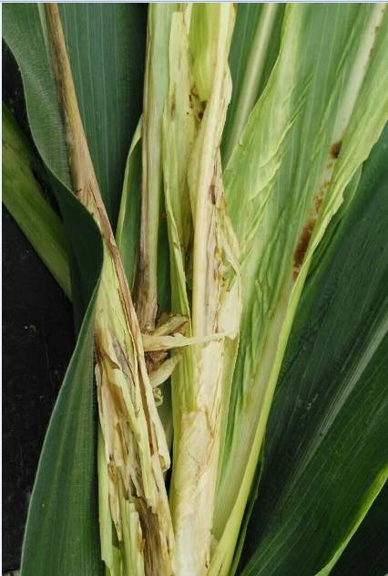 3、發病條件:夏季高溫高濕,是該病害發生的有利環境。雨水利于病原菌的傳播,特別是在喇叭口期遇到持續高溫易發生病害,病原菌一般從傷口或莖節、心葉等幼嫩組織侵入,蟲害尤其是薊馬、蚜蟲等的危害會加重病害發生。雨后或田間灌溉后,低洼或排水不暢的地塊發病較重。所以說高溫高濕有利于病害流行,害蟲或其它原因造成的傷口利于病菌侵入。