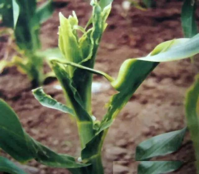 1、頂腐病葉片中間沒有黃化斑,主要形成黃、白、綠相間的條紋狀;而苗后除草劑藥害主要是不規則的斑點、黃化,嚴重者干枯;