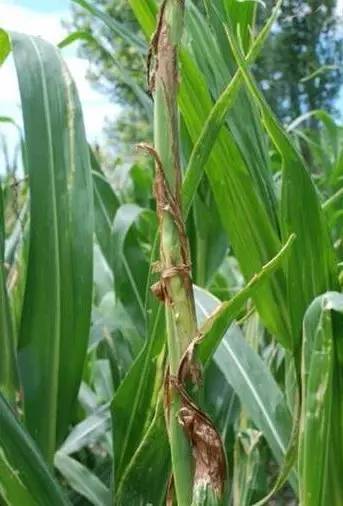 4、葉鞘、莖稈腐爛型 穗位節的葉片基部變褐色腐爛的病株,常常在葉鞘和莖稈髓部也出現腐爛,葉鞘內側和緊靠的莖稈皮層呈鐵銹色腐爛,剖開莖部,可見內部維管束和莖節出現褐色病點或短條狀變色,有的出現空洞,內生白色或粉紅色霉狀物,刮風時容易折倒。