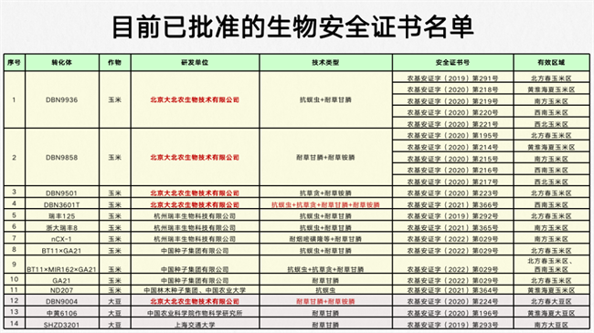 在品種布局上,大北農已獲得12個轉基因抗蟲、耐除草劑玉米生產應用安全證書和3個轉基因耐除草劑大豆生產應用安全證書。在生物技術專利上,大北農轉基因抗蟲耐除草劑玉米和大豆產品,已通過ETS和ISO9000雙重認證,累計獲得國內發明專利99件,國際發明專利37件。同時,大北農生物技術已建成包括基因克隆、性狀整合、品種選育、產品開發、應用推廣等環節在內的轉基因育種科技創新和產業發展的成熟體系。