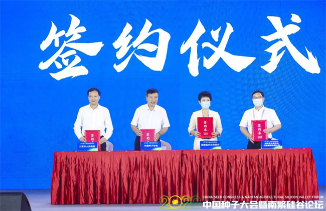 中國種子協會會長張延秋、海南省農業農村廳廳長何瓊妹、三亞市人民政府市長陳希、海南省農墾投資控股集團有限公司董事長包洪文作為代表共同進行“中國種子大會暨南繁硅谷論壇合作框架協議”簽約。