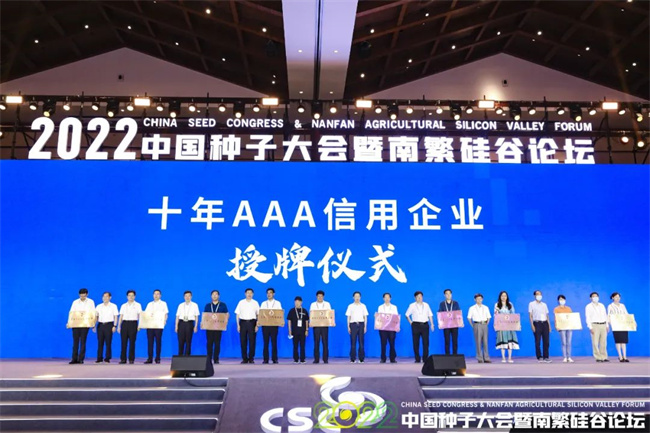 原農業部常務副部長劉成果、國務院國資委監事會原主席崔世安、原農業部黨組成員畢美家、原農業部總農藝師孫中華、中國種子協會會長張延秋、中國蔬菜協會會長楊雄年、中國種子協會顧問陶承光、王兆斌、張文軍、張堅勇為“十年AAA”信用企業、2021年AAA級信用企業代表頒發牌匾。