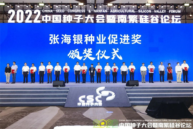 農業農村部原常務副部長劉成果,國務院國資委監事會原主席崔世安,農業農村部原黨組成員畢美家,農業農村部原總農藝師孫中華,中國種子協會會長張延秋,農業農村部科技發展中心主任楊雄年,中國種子協會顧問陶承光、王兆斌、張文軍、張堅勇以及安徽張海銀種業基金會副理事長張琴為2021年“張海銀種業促進獎”獲獎代表進行頒獎。