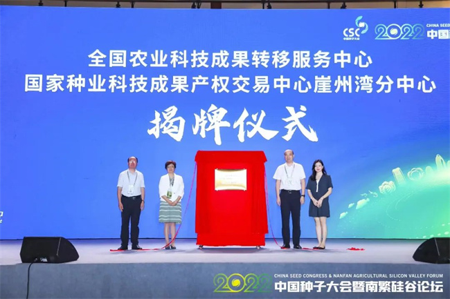中國農科院成果轉化局副局長馮艷秋、三亞崖州灣科技城管理局副局長葛瑞明、中國農科院南繁研究院院長彭軍等為全國農業科技成果轉移服務中心/國家種業科技成果產權交易中心揭牌。