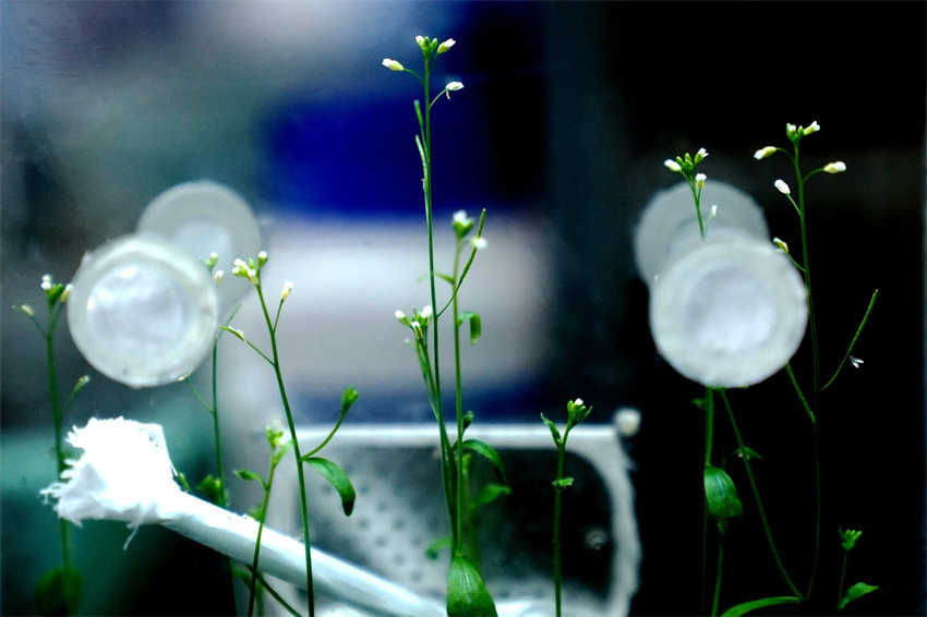 這是“太空同款”擬南芥培養單元中擬南芥開的花。 新華社記者 張建松 攝