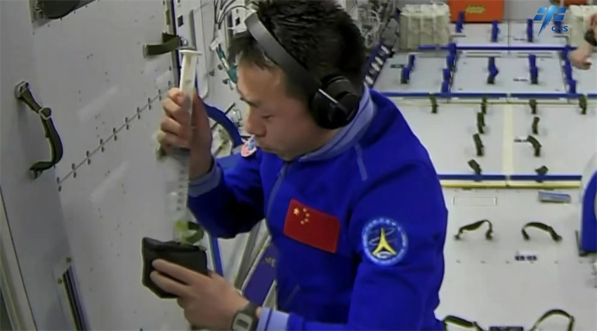 航天員蔡旭哲細心“呵護”在軌實驗生物樣品。(來源:中國載人航天工程辦公室官方平臺)