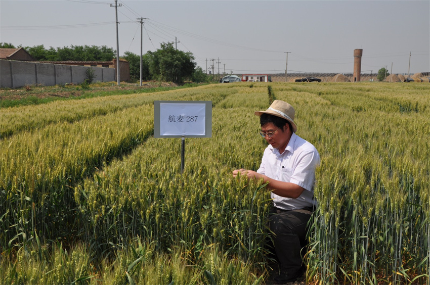 劉錄祥研究員田間調查太空小麥。(來源:中國農業科學院作物科學研究所)