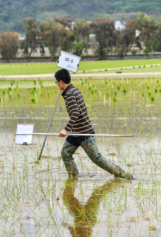2021年3月29日,華南農業大學國家植物航天育種工程技術研究中心王加峰博士為剛剛插秧太空稻的試驗田插上寫著“CE-5”的標識牌,這是嫦娥五號的拼音縮寫。當日,嫦娥五號搭載的太空稻種離開研究中心溫室,移栽到試驗田基地。新華社記者 劉大偉 攝