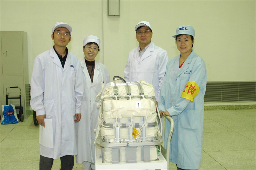 劉錄祥(右二)和工作人員在實踐八號育種衛星發射前完成載荷安裝。(來源:中國農業科學院作物科學研究所)