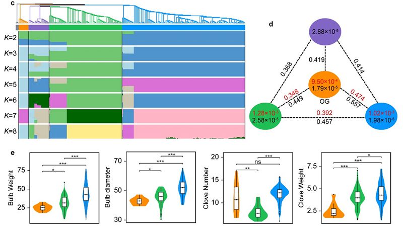 研究人員從國內外共收集了300余份大蒜種質資源,對其中230份大蒜資源開展基因分型測序(GBS)和群體結構分析,發現大蒜種質主要存在四個類群,其中位于中國的主栽的四六瓣蒜和多瓣蒜種質分別來自大蒜組群CG1 和CG2。科研人員對84個核心種質資源進行重測序,共檢測到129.4 Mb的變異。通過有效群體動態分析、基因流和馴化選擇區間分析推測CG1 和CG2分化于數十萬年前,之后各自獨立進化和馴化。深入分析CG1 和CG2的有害突變,發現經長期獨立進化和馴化后,組群間的有害突變重復率極低。大規模的轉錄組測序也表明,長期獨立進化和馴化導致CG1 和CG2組群間的轉錄組結構實現了重塑,9400個大蒜基因在兩組群間存在表達差異。