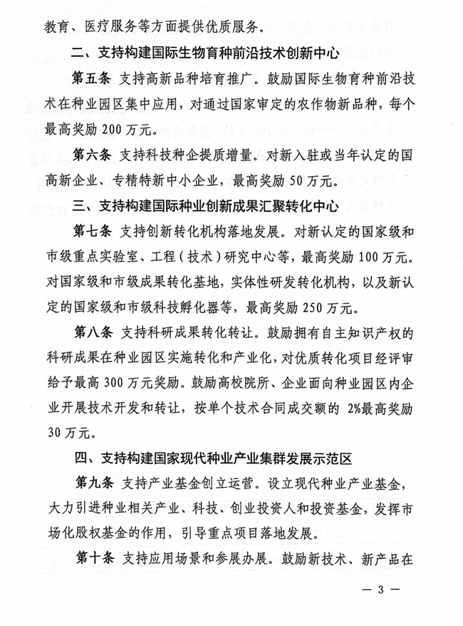 此外,“種十條”還設置了優化種業發展環境的相關措施,包括展會論壇獎勵、辦公用房補貼、應用場景獎勵、項目配套獎勵等,鼓勵更多的新技術新產品在園區示范應用,最高獎勵1000萬元。