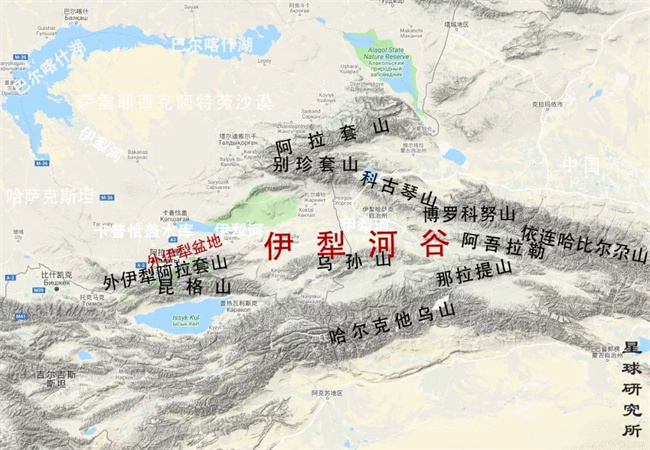伊犁河流域地形圖,伊犁河自東向西貫流,最終注入今哈薩克斯坦境內的巴爾喀什湖;因為有7條河流匯入巴爾喀什湖,所以國外亦將外伊犁及其外延稱為“七河之地”。