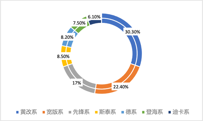 新疆普通玉米不同系列及市場占有率新疆玉米類型主要分為黃改系、寬版系、先鋒系、迪卡系、德系、登海系、斯泰系等7個系列分類。