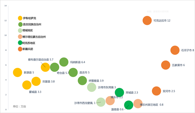 銷量排名前五的品種里面,除了華西 948 是中晚熟品種,其余均為中熟產品(積溫2450-2600攝氏度),這些中熟品種的普遍共性是有非常廣的適宜種植區域,基本把幾個較大的區域都覆蓋到(伊犁地區、博樂地區、塔城地區、阿勒泰地區)。
