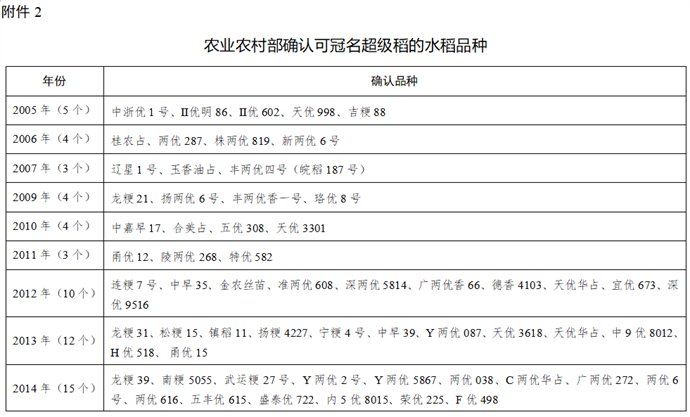 受農業農村部科技教育司委托,近期全國農技中心組織開展了2022年度超級稻品種確認工作。根據《超級稻品種確認辦法》(農辦科〔2008〕38號),經各地推薦和專家評審,現確認北粳1705、嘉禾優5號、嘉優中科13-1、隆兩優5438、中浙優H7、粵禾優1002、萬太優美占等7個品種為2022年度超級稻品種(附件1)。同時,因推廣面積未達要求,Y優1號、Q優6號、楚粳27、新兩優6380、陸兩優819、桂兩優2號、五豐優T025、沈農9816、徽兩優6號等9個品種不再冠名超級稻。目前,經農業農村部確認、可冠名超級稻的水稻品種共133個(附件2)。