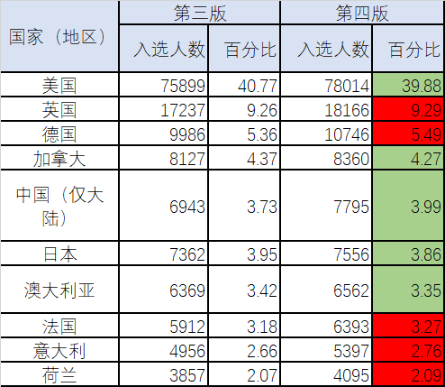 2022年10月發布的排名共收錄來自22個學科領域的195606名科學家,其中標注美國(USA)的科學家78014名,占總收錄人數的39.88%。標注中國大陸(CHN)的科學家7795,比第三版增加852人,超過日本,在全球排第5位。