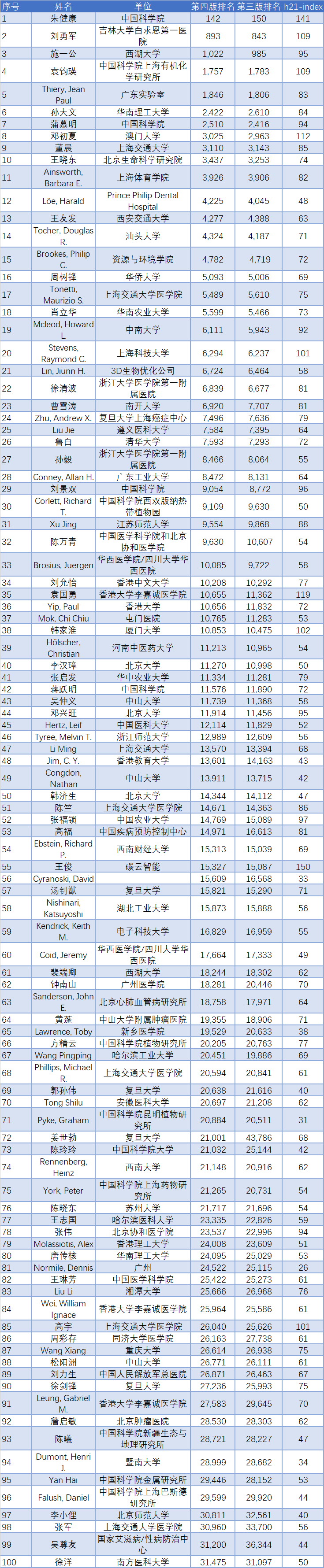 這一排名中排名最高的中國科學家依然是南方科技大學朱健康(排名142,第三版排名150)、蘇州大學何吉歡(排名172,第三版排名180)、四川大學徐澤水(排名190,第三版排名193),復旦大學趙東元(排名496,第三版排名810),上海交通大學Wilczek, Frank(排名564)。