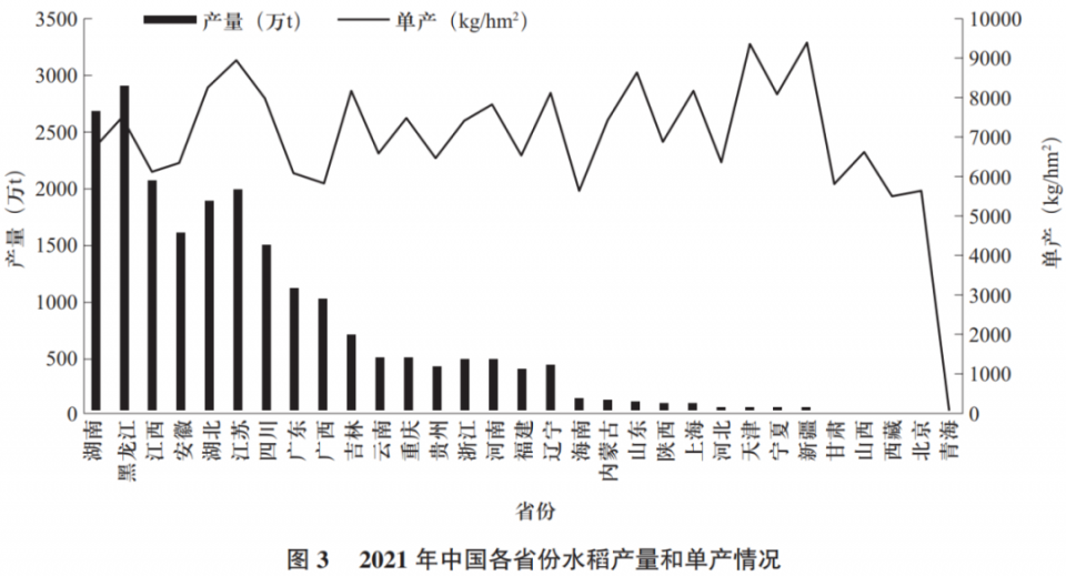 從各省的水稻種植情況看(圖2、圖3),2021年湖南水稻種植面積397.11萬hm²,排名第一,緊隨其后的黑龍江種植面積為386.74萬hm²,江西種植面積為341.92萬hm²。產量排名基本與種植面積一致,但單產水平卻不同,可以看到,排名第一的是新疆,單產9406.5kg/hm²;天津排名第二,單產9355.5kg/hm²,單產在7500kg/hm²(500kg/667m²)的省(區、市)有江蘇、山東、湖北、上海、吉林、遼寧、寧夏、四川、河南和黑龍江。湖南種植面積最大,單產6756kg/hm²,排在上述省份之后。
