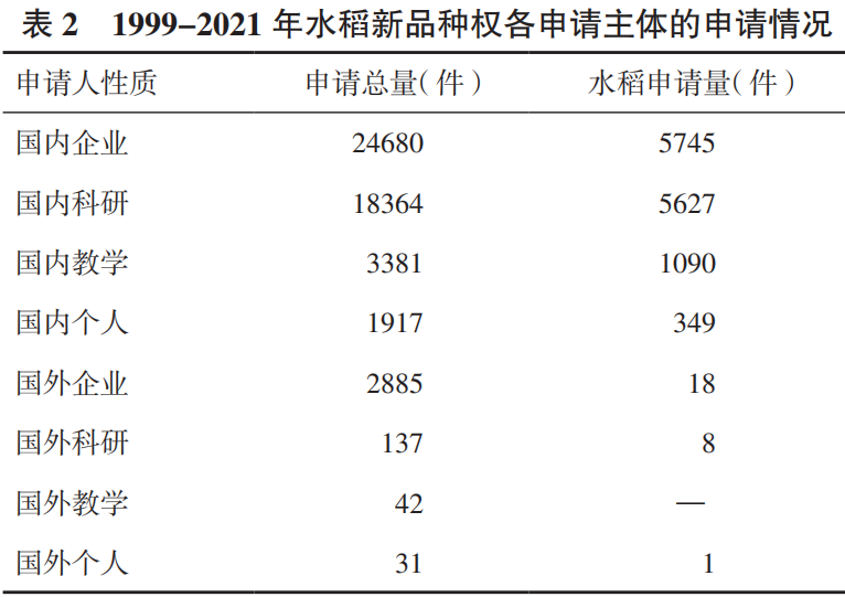 從品種權來看,1999-2021年國內申請12811件,占水稻總申請量的99.79%。從推廣的品種來看,2017-2020年推廣面積10萬畝(6667hm²)排前10位的品種都是自主選育品種。農業農村部也表示,水稻品種已實現了100%自主選育。