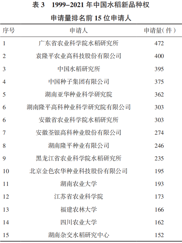 從個人或機構申請量來看(表3),申請量排名前15名(有兩個并列第6名,共16家單位)的申請人共申請了4406件,占水稻總申請量的34.32%,其中排名前3位的是廣東省農業科學院水稻研究所申請了472件;袁隆平農業高科技股份有限公司申請了400件;中國水稻研究所申請了395件。
