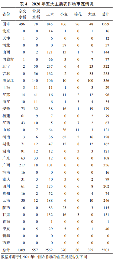2020年玉米、水稻、小麥、大豆、棉花五大主要農作物通過國家和省級審定品種數5203個。其中,玉米審定的品種數量最多,共通過審定2562個;水稻排名第二,共審定1866個品種;小麥審定370個品種,大豆審定325個品種,棉花共審定80個品種(表4)。