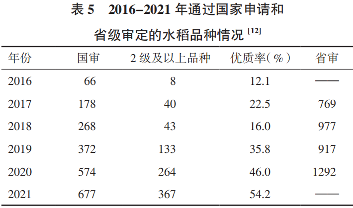 從2016-2021年審定的情況來看(表5),水稻審定品種逐年增加,2016年通過國家審定的品種66個,2021年國審品種677個,增加了611個,比2016年增長了10倍。優質水稻品種數量增長速度也比較快,2021年國審水稻品種達到國家或行業標準優質2級及以上的品種數量已達到367個,品種的整體優質率為54.2%,約是2016年的4.5倍。