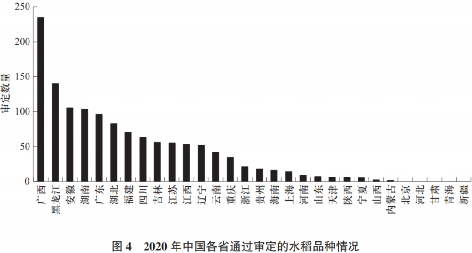 從2020年各省情況來看(表4、圖4),審定數量最多的是廣西,共審定235個品種;審定數量在100個以上的分別是黑龍江140個、安徽105個、湖南103個。