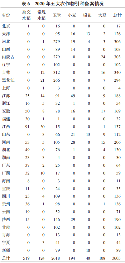 從引種備案情況來看(表6),2020年全國共引種備案主要農作物3603個。其中水稻643個、玉米2618個、小麥194個、大豆108個、棉花40個。水稻引種數量排名前5位的省份分別是江西121個、安徽58個、河南58個、湖北49個、廣西42個(表6)。