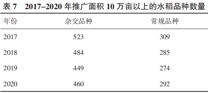 從推廣面積來看(表7),2017-2020年推廣面積10萬畝(6667hm²)以上的雜交水稻品種維持在449~523個,常規水稻品種維持在300個左右。