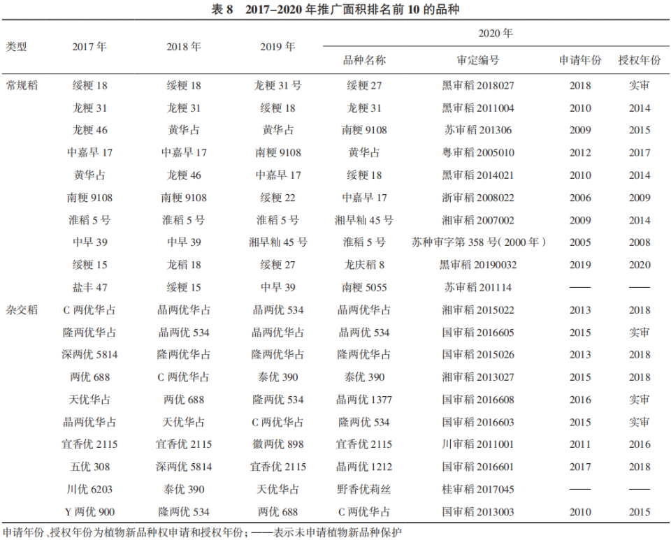 值得注意的是,隨著全社會知識產權意識不斷提升,推廣品種大多都申請了農業植物新品種保護,如表8所示,2020年推廣面積排名前10位的雜交稻和常規稻品種中,均有9個品種申請了品種保護。