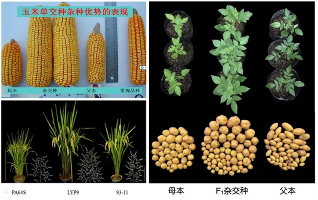 圖4 農作物雜種優勢表現:玉米(左上)、水稻(左下)和馬鈴薯(右)(水稻圖片來自Li et al 2016. PNAS 113(41):E6026-E6035,其他圖片來自網絡)
