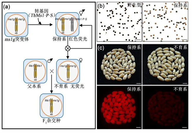 近年來,利用小麥隱性核雄性不育突變體進行雜交制種的新技術——小麥第三代雜交育種技術(國外稱為SPT,seed production technology)取得了重要進展。鄧興旺團隊將緊密連鎖的三個目標基因,“育性恢復基因-花粉致死基因-種子標記基因”,轉入小麥隱性核雄性不育突變體,獲得了集恢復和保持功能于一體的雄性不育保持系, 保持系自交可以繁殖用于雜交種生產的不育系 (圖5a)。鄧興旺團隊和杜邦先鋒分別使用Ms1基因或其同源基因作為育性恢復基因、花粉發育晚期特異表達的玉米α-淀粉酶基因作為花粉致死基因、糊粉層特異表達的紅色熒光基因作為種子標記基因構建智能不育載體,轉化小麥ms1突變體。育性恢復基因的存在使得ms1突變體從不育變為可育; 花粉致死基因導致含有轉基因的花粉失活, 因而轉基因植株中有活性花粉與無活性花粉的比例為1:1, 并且自交產生的種子中, 攜帶轉基因的熒光種子和不攜帶轉基因的非熒光種子呈1:1分離。熒光種子即保持系, 自交繁殖不育系和自身; 非熒光種子即不育系, 作為母本用于雜交種的生產。兩個實驗室的工作各自獨立驗證了第三代雜交育種技術在小麥中的可行性(圖5b, c)。小麥第三代雜交育種體系產生不育性狀穩定的不育系; 雜交配組自由、雜種優勢利用率高,具有廣闊的利用前景。