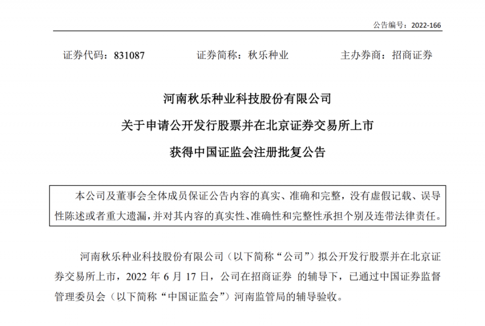 小貼士:根據公開數據顯示,秋樂種業(831087)2021年營業收入為338565907元,歸屬母公司凈利潤為40074040元,凈資產收益率為16.26%,營業收入增長率為24.6%。目前主辦券商為招商證券,交易方式為集合競價交易,歸屬創新層。