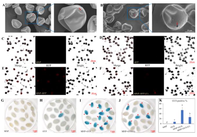 A. 關閉狀態的花(hua)粉萌(meng)發(fa)孔(kong);B. 打(da)開狀態的花(hua)粉萌(meng)發(fa)孔(kong);C-F. 以紅色熒光蛋(dan)白基因(yin)RFP為報(bao)告(gao)基因(yin),檢測不同條(tiao)(tiao)件(jian)下花(hua)粉的轉化效率;G-H. 以GUS為報(bao)告(gao)基因(yin)檢測不同條(tiao)(tiao)件(jian)下,幼胚轉化效率。