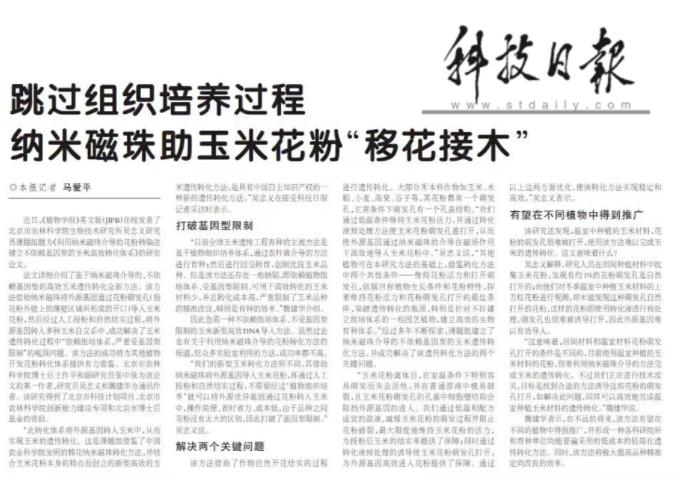 在實踐中突破自我,在積累中收獲碩果。近年來,我院生物所玉米分子(zi)育種團隊立足(zu)崗位,潛心鉆(zhan)研,踐行應用(yong)基(ji)礎研究精益(yi)理念,獨辟(pi)蹊徑,創(chuang)建具有(you)我國自主知(zhi)識產(chan)權的(de)全新玉(yu)米(mi)(mi)遺傳轉(zhuan)(zhuan)化方(fang)(fang)法(fa)“納米(mi)(mi)磁珠介(jie)導的(de)不依賴(lai)基(ji)因型的(de)玉(yu)米(mi)(mi)新型高效轉(zhuan)(zhuan)化體系(xi)”。該(gai)方(fang)(fang)法(fa)探明了維(wei)持花(hua)粉活力和花(hua)粉萌發孔(kong)打開的(de)最佳條件,突破了玉(yu)米(mi)(mi)遺傳轉(zhuan)(zhuan)化過程中“依賴(lai)組(zu)培體系(xi),嚴重受基(ji)因型限制(zhi)”的(de)瓶頸問題(ti),達到國際先進國內領先的(de)水平。