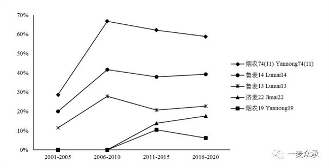 圖3 2000年-2020年煙農74(11)、魯麥14等核心親本在山東省的衍生材料統計圖(翟曉靈等,2022)