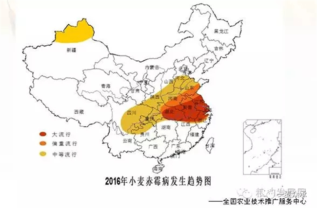 小麥赤霉病又名紅頭瘴、爛麥頭,是由禾谷鐮刀菌等真菌引起的一種世界性小麥病害,在小麥的整個生育期內均可發生,會造成大規模的苗腐和穗腐,其中穗腐一般出現在灌漿后期,對小麥產量與品質的影響最大。近年來,在耕作模式以及氣候等因素的影響下,我國小麥赤霉病大流行頻率逐漸增加,重發區主要集中在長江中下游冬麥區、黃淮麥區南片等區域(圖7),且有不斷北上的趨勢;赤霉病在山東省的發病情況從偶發病害到上世紀末演變為常發病害(國棟等,2019),2021年青島在小麥揚花期多雨,導致赤霉病發生嚴重。赤霉病不僅影響小麥的產量和品質,并且會產生大量霉菌毒素尤其是DON(Deoxynivalenol,脫氧雪腐鐮刀菌烯醇),俗稱“嘔吐毒素”(vomitoxin),被世界衛生組織定為三級致癌物,病麥率含量達到4%以上就失去了食用價值。