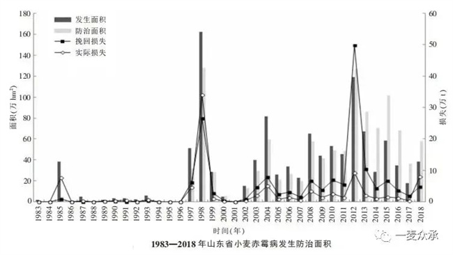 圖7 小麥赤霉病在全國的發生趨勢(全國農業技術推廣服務中心)和山東省的發病情況(國棟,2019)